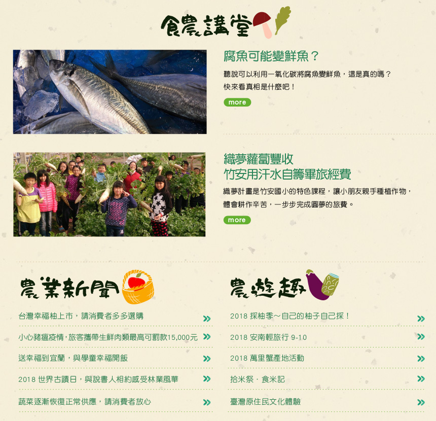 腐魚可能變鮮魚? 織夢蘿蔔豐收 竹安用汗水自籌畢旅經費 台灣幸福柚上市 請消費者多多選購 小心豬瘟疫情,旅客攜帶生鮮肉類最高可罰款15,000元 鱻送幸福到宜蘭 與學童幸福開飯 2018世界古蹟日 與說書人相約感受林業風華 蔬菜逐漸恢復正常供應 請消費者放心 2018採柚季~自己的柚子自己採! 2018安南輕旅行9-10 2018萬里蟹產地活動 拾米祭.食米記 臺灣原住民文化體驗