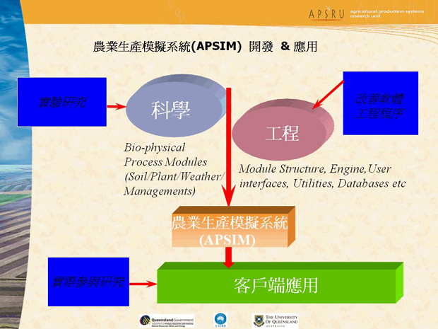 農業生產模擬系統 APSIM Agricultural Production Systems Simulator 計畫是由APSRU開發的軟體。自1992年至今已16年,政府每年投入該計畫澳幣2百萬元,由生物物理學家研究土壤、農作物與氣候等實驗數據資料與軟體工程結合進行開發,導入測試的農戶遍及全國,包括昆士蘭、新南威爾斯、維多利亞、南澳與西澳等州,再經由導入農戶過程中持續改善該系統,到今年八月已更新至第6.1版,未來將朝軟體產品化開發提供精準預測為目標。