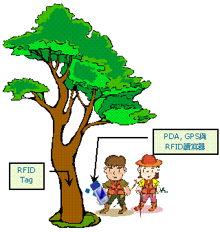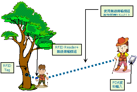 過調查者手部之被動式讀取器,將資料寫入釘掛於樣木上的電子標籤。