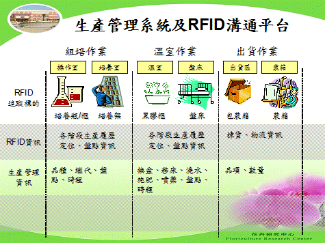 行政院農業委員會農業試驗所花卉研究中心於行政院農業委員會資訊中心計畫經費支持下,進行無線射頻辨識技術(Radio Frequency Identification, RFID)應用於蝴蝶蘭生產管理之應用情境規劃及概念驗證。