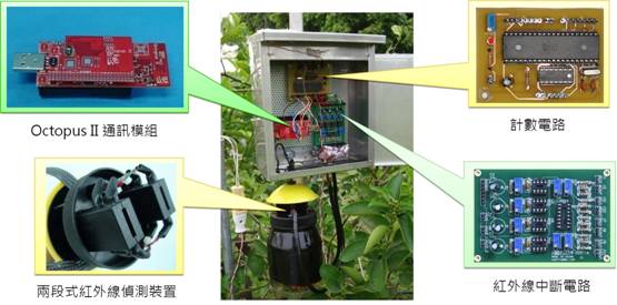 根據使用者研究對象不同,WSN的應用也有不同型態。例如,臺灣大學與臺北科技大學共同組成的WSN研究團隊為了獲得田間害蟲的活動狀況,在前述之氣象監測基礎上,增加了東方果實蠅、斜紋夜盜蟲自動化誘捕計數裝置,並將此等裝置與無線通訊模組結合,形成田間蟲害自動化監測專用的無線感測器節點。藉由計算捕捉到之害蟲數,將可以依此推估害蟲的活動狀態,並能夠更進一步作為農藥使用時間、地點之依據。圖2與圖3分別是用於監測東方果實蠅之感測器節點與匣道器。前者可以測量蟲數與溫溼度,後者則外接市售氣象模組,可測量多種氣象數據。