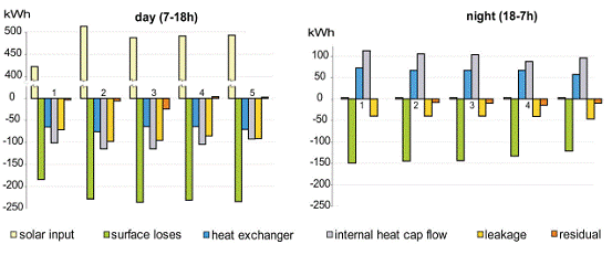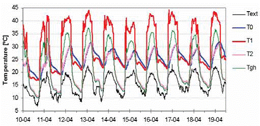 此WATERGY系統已經評估兩年(Buchholz et al., 2006),就像通常一樣仍有許多技術問題待克服。現今設計自然通風的冷卻能力結果是不足的。雖然如此,青豆(green bean)在秋季與冬天期間被成功種植而且沒有使用殺蟲劑。在春天與夏天,再次地秋葵之栽培也不需殺蟲劑而且是成功的。在溫度控制上試驗顯示可接受的效力(如圖6、圖7與圖8),亦顯示在熱帶地區與傳統被動系統相較其栽培期間可以被延長,而且總耗水量被降低75%,這是一項重大成就。