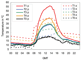 圖8、顯示冷卻效果的溫室內溫度(比較兩天的結果),實線係系統不運作時之溫度,虛線係系統運作時之溫度(T1 =在塔頂冷卻導管入口之空氣溫度;T2 =在塔底冷卻導管出口之空氣溫度;T3 = 在溫室中空氣溫度;T4 = 內屋頂上方空氣溫度;T0 =外界空氣溫度)。
