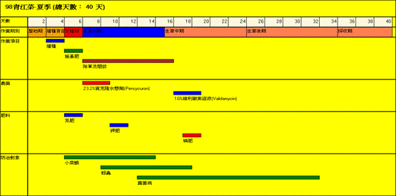 系統可提供詳細記載栽培時所建議使用的農藥肥料資材,以及重要的作業流程等外,藉由栽培流程重點管理之標準化作業,建構一個具有一致性田間生產表,方便契作農民作履歷記錄使用。農友依從指示進行生產作業,採收由中心按契約規定購買,再運用RFID的技術管理容器在運銷中出入庫及農產品入退貨作業。