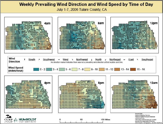 環境面的地圖資料主要來自美國國家高程資料庫(National Elevation Dataset; NED),可達10公尺解析度。此外,為了瞭解風向對於農業噴灑的影響,由美國海洋暨大氣總署(National Oceanic and Atmospheric Administration,NOAA)取得2006年7月1~7日範圍內的風向預測資料(圖2),這項資料包含監測區間內每小時的風速及風向的變化資料,並可達到5平方公尺的精準度。