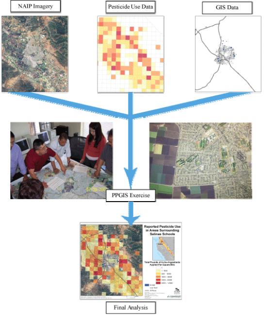 PPGIS的應用技術被應用來獲得當地農民工作者的知識及衍生出的空間資料。在這項研究中,研究團隊將國家航測計畫(National Aerial Photography Program; NAPP)的彩色正射影像套在GIS,並加上道路及區塊說明,讓社區成員據以指出他們曾經觀察到有農藥擴散(pesticide drift)的位置(圖3),此外PPGIS也用於找出社區成員活動的地區及範圍,包括公園、公共場所、居住地點等,PPGIS方式可以整理出大量及豐富的在地資訊(local knowledge)。為確認由PPGIS所獲得的空間資料的正確性,研究團隊也會以可取得的官方空間資料來與PPGIS的資料進行關連比對(cross-reference),以強化資料的正確性(validity)。