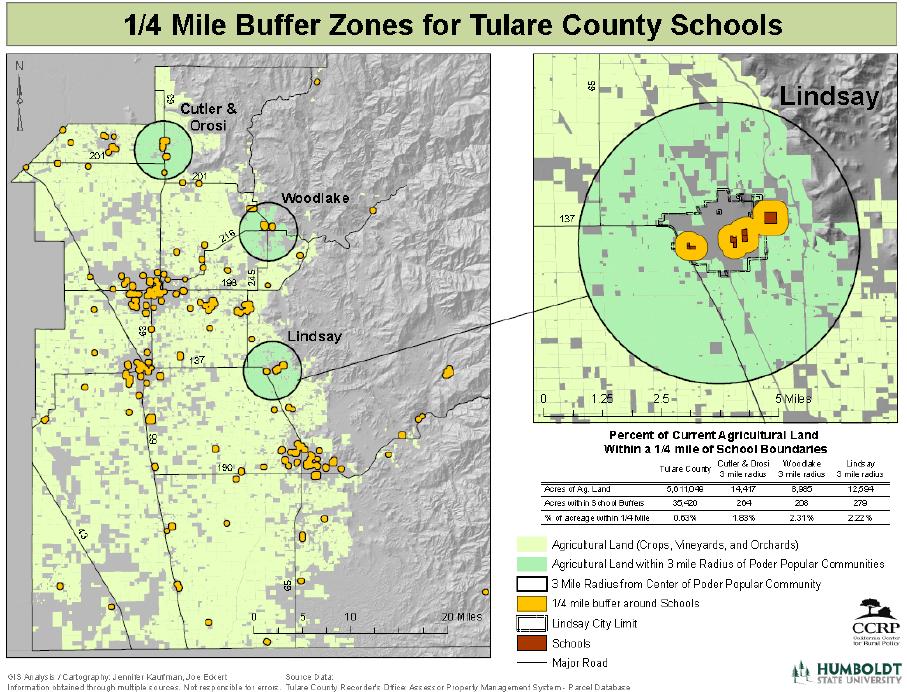 在這篇研究中也探討敏感地區(例如:學校)的緩衝區域(buffer zone)規劃及考量,研究社區內所有學校的空間資料,然後套疊到NAPP的影像上,並確保所有與學生活動有關的運動場及遊樂區都被包含在內(圖4)。研究中探討在學校校區(包含運動場)以外應該建立以半徑4分之1哩(約400公尺)為範圍的緩衝區域(目前加州地區關於學校緩衝區域的規定並不一致),然後在緩衝區域內需限制農藥噴灑的時間及方式。這項作法值得台灣做為參考,以保障學童的健康。