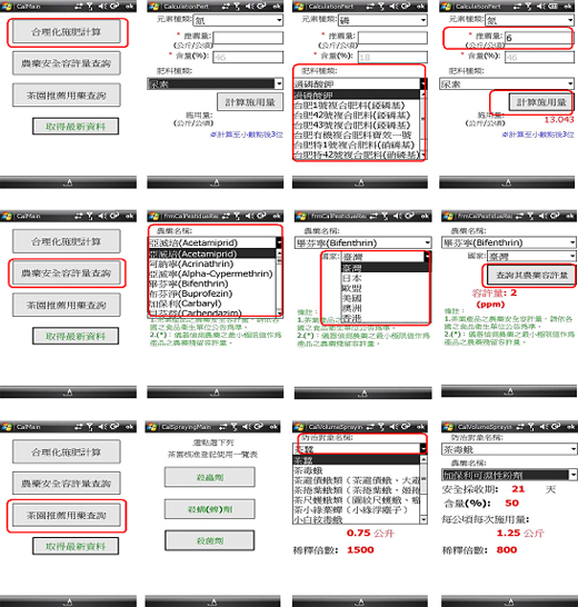 本系統另建置之小幫手功能不需登入帳號即可使用,其操作之畫面如圖2所示,功能包括:(1)合理化施肥計算:系統內建常用於茶園之12種肥料資料,在已知推薦量時,計算各種類肥料每公頃所需要的施用量,可用以評估肥料施用量是否合宜;(2)農藥安全容許量查詢之功能,可查詢67種茶園之核准用藥,其於臺灣、日本歐盟等國之安全容許量,在茶葉銷售或出口時是否符合當地之規範;(3)茶園推薦用藥查詢之功能,可依照防治對象如殺蟲劑、殺蟎(蜱)劑、殺菌劑等,共60種核准用藥之防治對象名稱、農藥名稱、安全採收期、含量、每公頃施用量、稀釋倍數等資訊,可提供茶農在考量防治對象、預定採收時程、使用量等因素下用藥的決策。