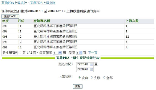 由智慧型手機輸入生產紀錄,操作方式為點選、下拉式選單及輸入等方式鍵入資料,並且由輔導示範之茶農成功完成資料之上傳,從管理介面可查詢上傳情形 (如圖3)。