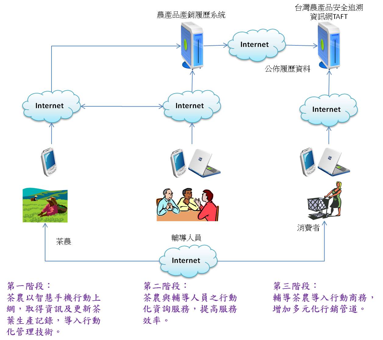 本計畫共分成三個階段,架構概念圖如圖4所示。民國98年執行第一階段,為行動化管理技術之導入,讓茶農以智慧型手機隨時隨地均可輸入茶葉生產記錄,以簡化資料維護的程序,並可將茶樹推薦用藥、農藥安全容許量及施肥推薦用量計算下載至手機介面上,方便茶農參考。