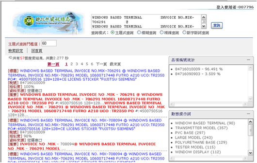案例說明:查詢稅則是一項資訊龐雜的比對工作,從超過兩千萬筆歷史資料中找出過往不同貨品的稅則與稅率,是海關人員經常性的工作與困擾,簡單實用的操作方式,反而使得作業流程縮短,工作效率加倍,也真實的符合全國第一線關稅人員的需要。 |