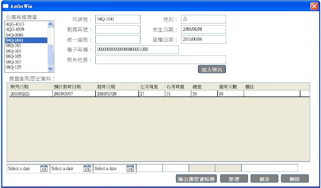 如下圖3所示,為鹿隻產茸資料系統功能畫面圖。主要記錄公鹿的歷年產茸記錄,並可以針對每一次產茸做照片記錄,讓使用者清楚瞭解每一次產茸的相關資料。藉此,可以分析及參考歷史資料之後,能更精準的預估下一次割茸日期,避免發生過早割取鹿茸之後,造成作業上的不便。