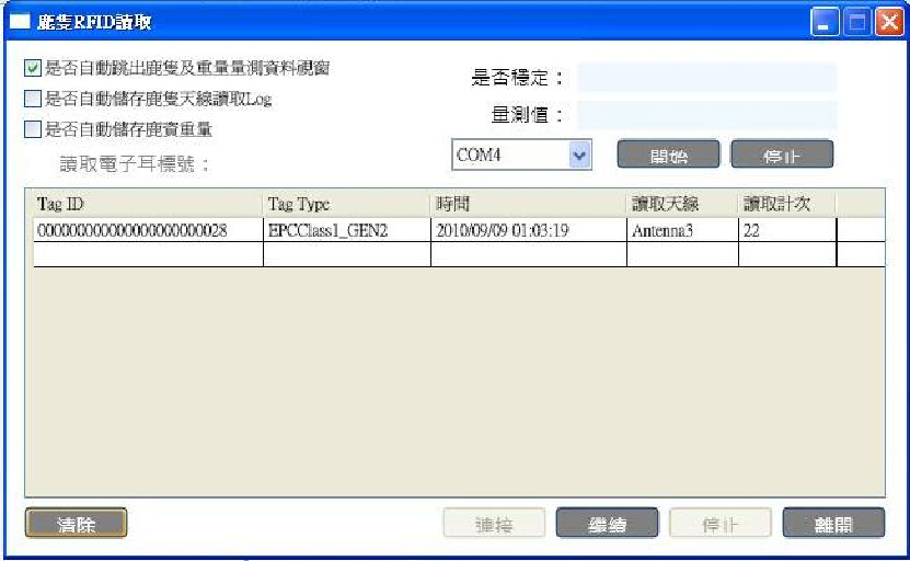 如下圖2所示,為系統整合連結到鹿舍建置的RFID讀取器讀取畫面圖。當鹿隻通過RFID讀取器設備時,讀取到的RFID耳標資訊便會呈現出來,並且會將此筆資料暫存到資料庫內,提供使用者可以瞭解在當日共執行了多少數量及哪些鹿隻有被驅趕出來進行作業。