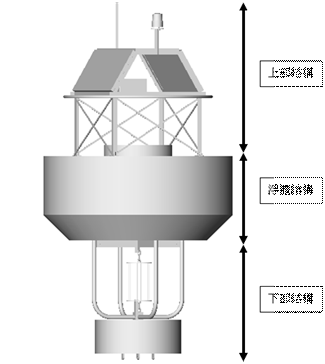 4具主次節點浮標外觀設計皆可分為上部結構、浮體結構及下部結構(圖2)三部份。上部結構的主要包括太陽能板、架設GPS天線、ZigBee天線及用於警告附近船隻之具太陽能自行供電航行警示燈。浮體部分之結構的主要功能為連結上、下部結構並提供浮標整體的浮力,並在內部設計一個儀器艙室以容納並保護所需之訊號傳輸及電源控制設備,並於外殼與儀器艙之間填充發泡劑,以降低受撞擊之衝擊力及增加浮標之浮力。而下部結構主要功能為聯結錨碇裝置以避免浮標漂流及增加底部配重塊以降低浮標受浪之搖晃幅度,並在下部結構和錨碇端之間設置一便於維護之可拆卸式儀器架,以便將水質觀測儀器固定在其中。 |