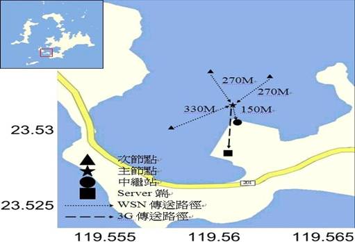 | 圖1 伺服器端、岸置中繼站、WSN浮標節點(4處)設置區位圖 |