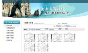 為顯示各節點浮標所測即時資料,本研究同時開發一WSN即時監測與預警網站系統(圖10)。本網站系統將可即時展現各主次浮標10分鐘間隔連續傳送之各項電力、GPS位置及各水質參數資料、主節點浮標之即時水下影像,以及整合現有氣象站資料,並可將所測得之水質及氣象資料繪製出等值線圖或差異値圖,以便於了解灣內水質分布情形。系統亦可約每6小時自動分析及繪製漲退潮期及半潮期水文參數等值線圖及異常值圖,並製作每旬及每月之平均等值線圖及差異值圖,而各幅圖均有其對應之統計報表。另可有線上設定參數、日期,查詢歷史資料進行繪製及統計。