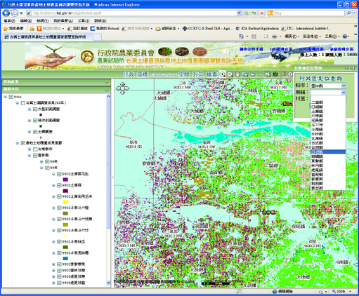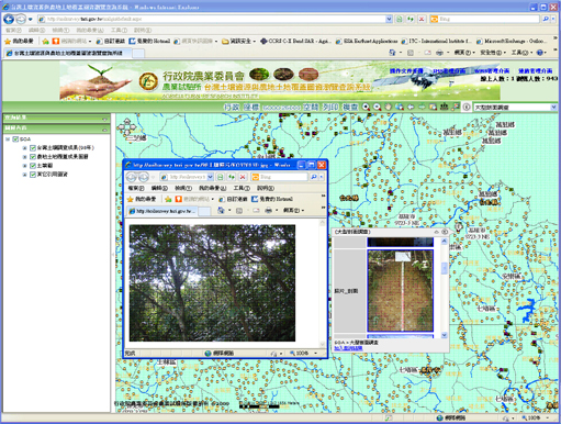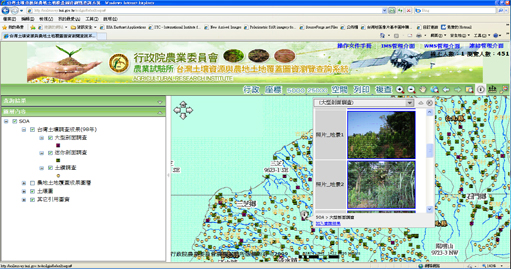本系統於99年度開始進行網路發佈與展示之實際運作測試,目前已上線的資料有97~98年之農地土地覆蓋圖180個圖層(圖-3),98年土壤調查的土鑽觀測、土壤迷你剖面、土壤大型剖面調查成果點位圖層(圖-4)、土壤圖及其它相關引用圖資;目前系統展示圖層合計約有199個。系統主要以WMS (Web Map Service)格式進行圖資發佈,並有網路平台介面提供網路瀏覽查詢,其功能包括:圖資展示、屬性表查詢、調查照片瀏覽(圖-5)、距離量測、圖資列印等功能。若欲進行快速空間定位查尋,本系統也具有座標、行政區(圖-6)、1/5,000及1/25,000圖幅區域等快速查詢功能,使用者可選擇適合自己的查詢方式。 |