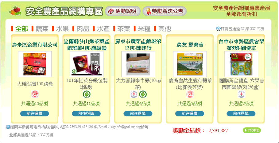 行政院農業委員會為鼓勵消費者選購有標章認證的安全農產品及推廣農民應用電子商務銷售安全農產品,即日起至12月15日推出安全農產品網購專區,鼓勵消費者選購安全無虞、品質有保證的農產品,進而協助安全農產品透過電子商務進行銷售,並協助農民拓展銷售市場,並提供農產品最低95折優惠,吸引消費者上網選購。目前已超過40家農戶,300項多項通過安全標章認證的商品於網購專區進行銷售(http://agsafe.coa.gov.tw/health_index.php)。