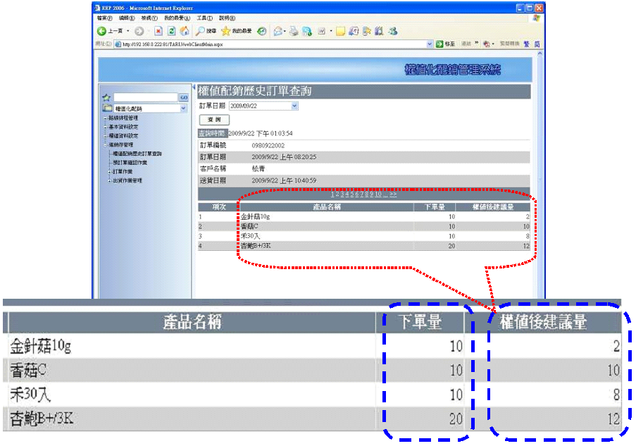 圖8、訂單大於進貨量時,權值化配銷模擬系統建議配貨畫面