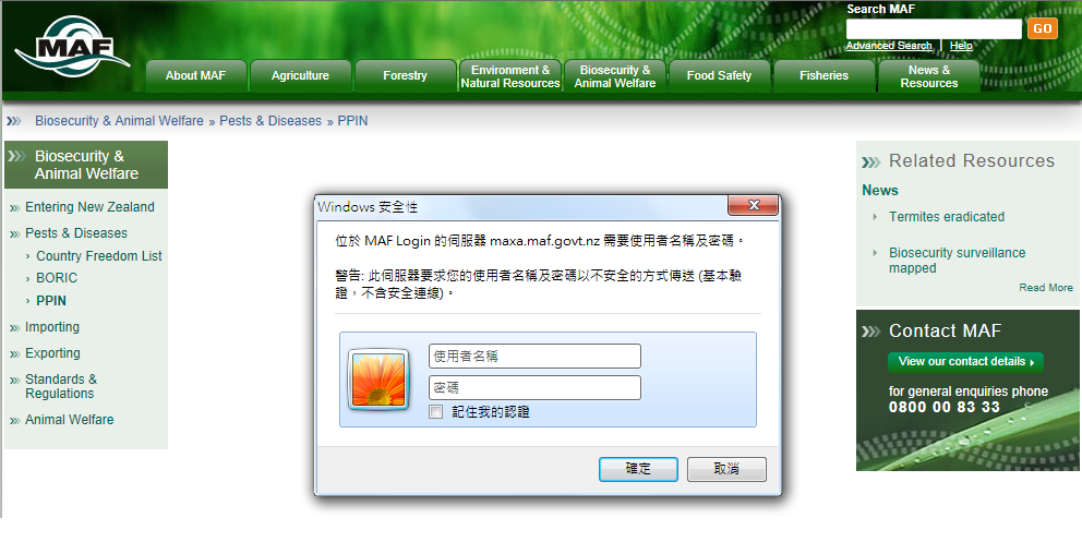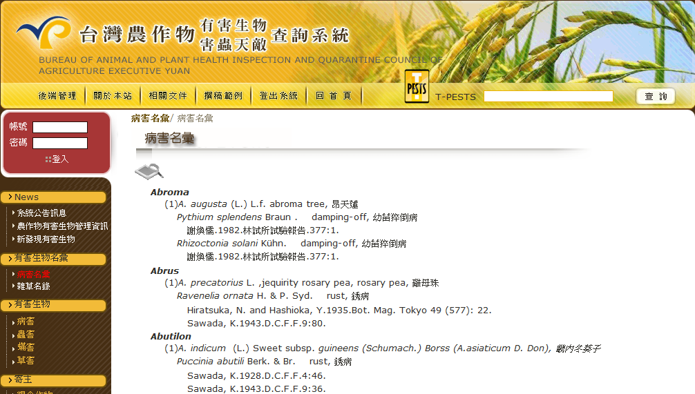 目前全球植物有害生物資料庫,仍以CABI Plant protection compendium最先進且完整,其功能已擴展至線上鑑定系統等多元服務,是目前唯一商業運轉的作物有害生物資料庫。至於許多國家級研究機構所建置的綜合或專門類群的植物有害生物資料庫,則完整度及使用方便性,均有不同的情況。例如美國農部所屬農業研究院之真菌資料庫(http://nt.ars-grin.gov/fungaldatabases/index.cfm),是一個國際知名的開放性資料庫,提供一般使用者進入查詢全球真菌生物的相關資訊,其基礎資料庫有真菌分類、地理分布、寄主範圍等,尤其分類資料庫最為完整,由於有非常優秀的真菌學者專責維護,其分類權威性全球知名;紐西蘭生物安全局的資料庫(http://www.maf.govt.nz/biosecurity-animal-welfare/pests-diseases/ppin):僅提供限定的使用者進入(圖1),為一管制資料庫,須申請並經審核通過成為會員方能進入使用;澳洲植物健康管理局的有害生物資料庫(http://www.planthealthaustralia.com.au/index.cfm),也僅提供限定的使用者使用,並不提供一般人進入。上述紐西蘭及澳洲的有害生物資料庫,除提供資料搜尋外,均與該國相關博物館或生物蒐藏機構合作,整合成為一個綜合性兼具診斷鑑定與資訊提供的系統。
