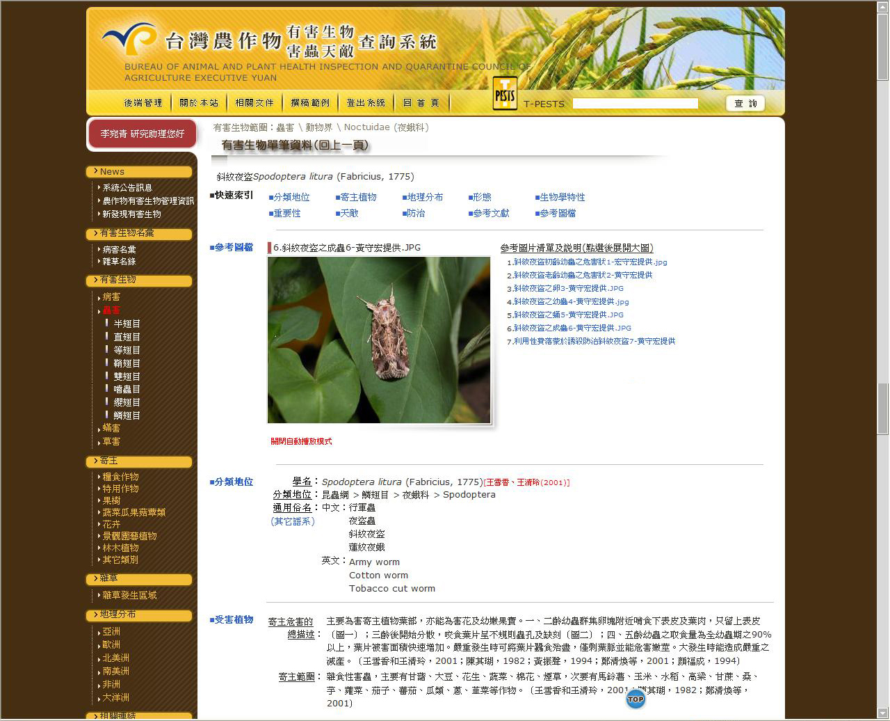 有鑑於各先進國家之植物保護單位,均設立專門收集本國甚至全球檢防疫資訊資料庫,作為各國作物安全及農業貿易政策擬定之重要參酌情報。而我國建構有害生物資料庫的想法,可追朔到民國1998年,農試所鄧汀欽博士收到英國CABI組織的邀請撰寫玉米銹病,作者等得窺其建置全球植物保護資料庫的基本格式,即興起建立我國植物保護資料庫的構想。復於民國2001年在防檢局接待紐西蘭生物安全局官員時,才深切的了解全球作物有害生物資料庫,對於國家農業的重要性。因此,2003年在吳文哲教授及石憲宗博士的合作下,結合台大、中興、成大、農藥所、農試所等學者專家,組成全方位的團隊,開始我國有害生物資料庫建置計畫;現今已建立一完整的系統及資料庫架構,並於各資料庫內,輸入相當完整充實的國內作物有害生物及天敵資料。