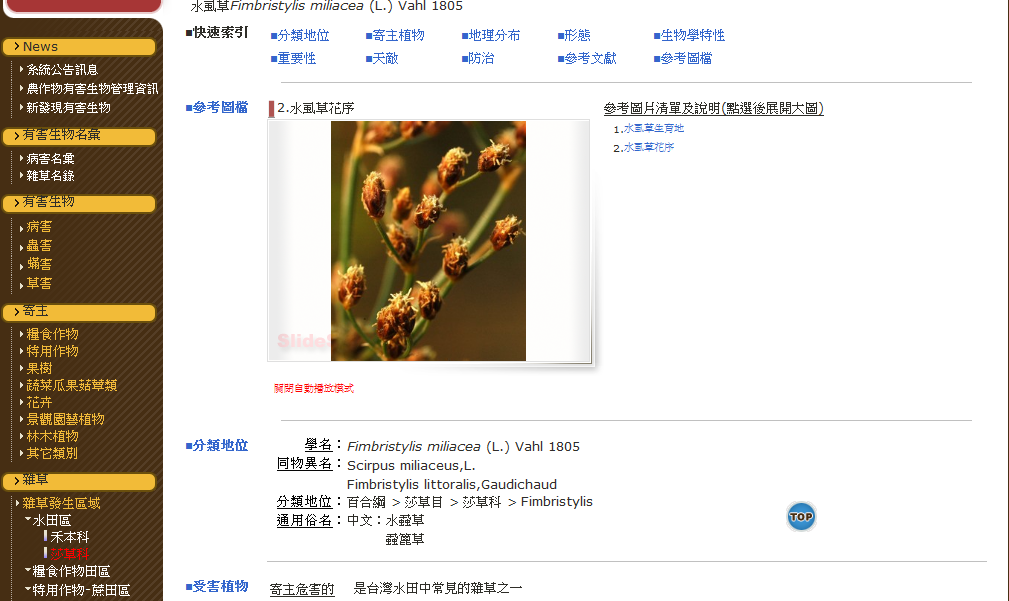 提供使用者查詢有害生物單筆資料表,可依作物種類(糧食作物、特用作物、果樹、蔬菜瓜果菇蕈類、花卉、景觀園藝植物、林木植物、其他類別)、地理分佈(共包含全球6大洲、29個洲分區與221個國家名稱)或有害生物的種類(病害、蟲害、草害、蟎害、其他有害生物)來查詢(圖4)。也可利用T-Pests字串蒐尋功能,以有害生物或作物的普通名或學名查詢(圖5)。雜草則特別再提供利用雜草類別來查詢(如圖6)。
