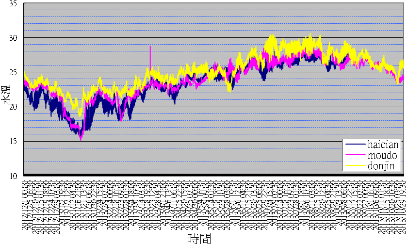 目前所設置三個不同位置底碇測站,依系統時間同步進行資料蒐集,提供了不同空間水溫的比較。以2013年北中南三測站全年的水溫的變動來看,我們可以發現澎湖海域水溫度呈北低南高的情形,除了5月中旬和下旬,曾出現了東吉嶼水溫同時低過海墘與目斗測站的情形外,大部分時間東吉測站的溫度均為最高。而在冬季低水溫期間,東吉水溫明顯高於海墘與目斗嶼可達4℃之多,而在最低溫時期目斗嶼與海墘嶼的溫度幾乎趨於一致(如圖3)。監測期間東吉平均溫度約為25.24℃,標準差為2.47℃;海墘嶼平均溫度為23.2℃,標準差為3.10℃;目斗嶼平均溫度為24.14℃,標準差為2.80℃,以上這些由WSN測站所獲得的水溫數據,均反應出澎湖週遭海域的溫度變化,受到複雜因素的影響,值得進一步的探討。