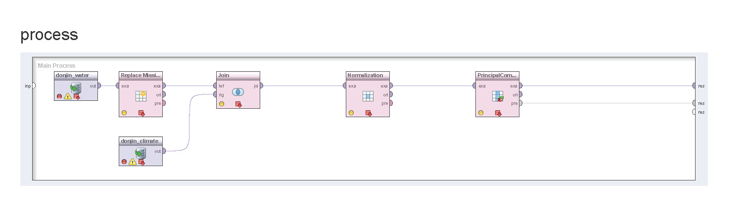 為了分析由WSN水質監測系統所蒐集大量水溫資料,本研究結合資料探勘(Data Mining)技術,對水溫的變動進行有趣樣式(interesting patterns)的分析,做為未來水溫走勢預測的基礎。以 OpenSource 資料探勘工具 RapidMiner 針對 2012 年 12 月 25 到 2013 年 2 月 10 日東吉測站海水溫度下降至該年度最低溫,再回升至21℃的過程,配合由中央氣象局所取得的東吉嶼氣象站的氣象資料,包含逐時平均風速、平均氣溫與平均氣壓進行分析。探勘程序可以參考圖 4,利用主成份分析(Principal Component Analysis;PCA)的方法,進行特徵值與特徵向量的運算萃取。