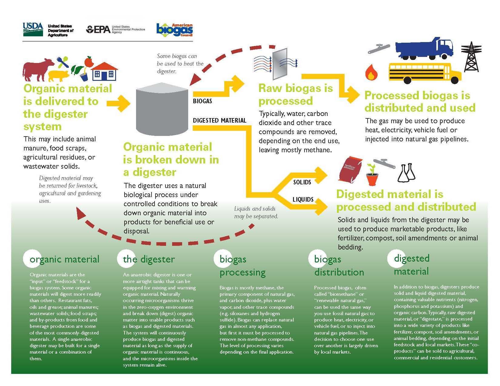 沼氣(Biogas)是甲烷和二氧化碳的混合物,是有機物質在隔絕氧氣的情況下,細菌分解所產生的氣體,通常含有50-70%的甲烷,30%-40%的二氧化碳,以及硫化氫,氫,氮,和矽氧烷等其它成分的含量,已經是一種被美國和世界各地所使用的有效能源,在美國已經有超過2000個沼氣製造地點。沼氣系統俱有採集排入到空氣中的甲烷並使它產生能量(例如電、熱、汽車燃料)的潛力,每個系統都包含基礎設施去管理有機廢棄物並產生能源,能源產物通常來自沼氣,而其他產物從沼氣系統產生的固體和液體材料所製成。在美國,甲烷是第二常見的溫室氣體,其排放量佔美國人為溫室氣體排放量的9%,而這些排放量36%來自於農業部門,相當於兩億噸的碳污染。使用能減少甲烷排放的沼氣系統,能減少燃燒石化時的排放量,並支持政府提出的能源策略。