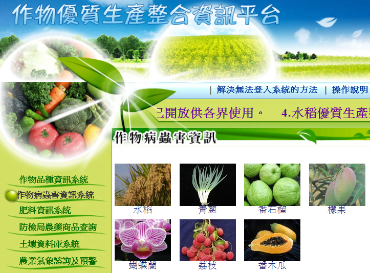 圖1、作物病蟲害資訊系統首頁,內含數種作物病蟲害資訊系統。 |