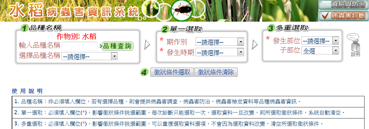 診斷頁面(圖2-A)中,第1步驟的品種名稱選或不選並不影響診斷結果:若選取,系統會聯結到作物品種資訊系統,擷取該品種的病蟲害特性資訊,一併顯現在查詢結果中;倘若未選,則查詢結果僅提供診斷相符之病蟲害的知識和防治策略。第2步驟中可選取期作別及病蟲害發生時期(單一選項)。第3步驟可根據植株受害部位的現況,選擇多個發生部位與其子部位。