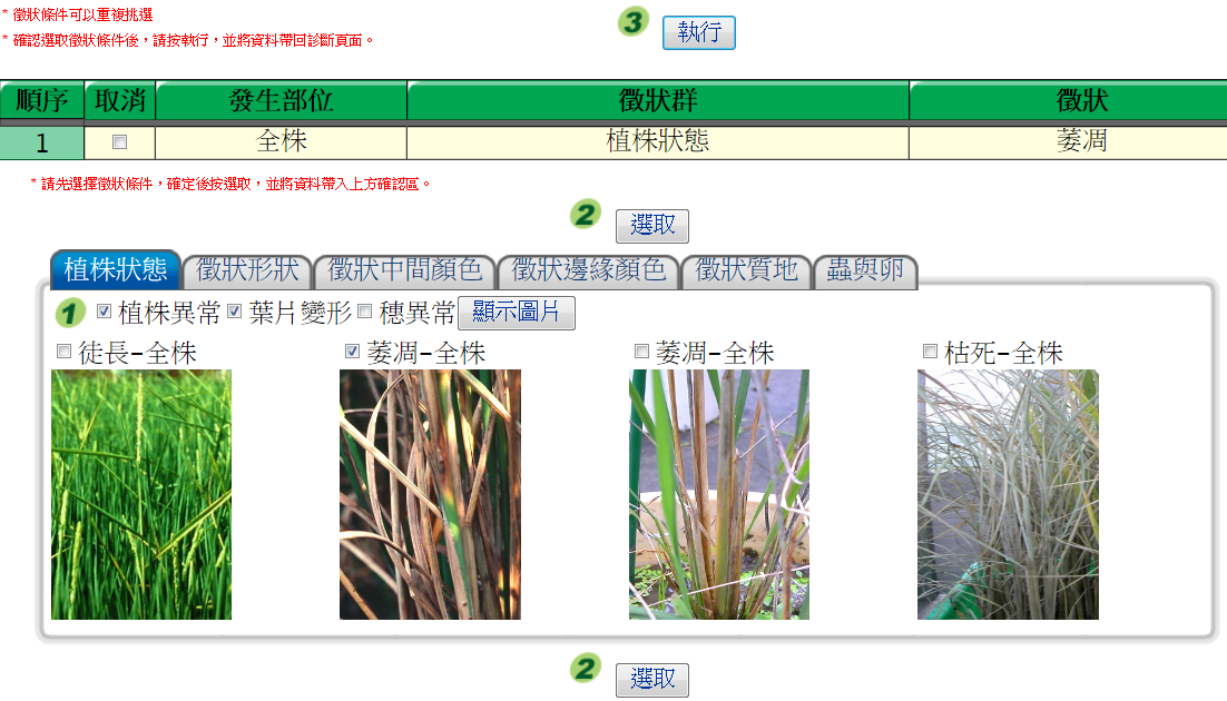 點選診斷頁面(圖2-A)的第4步驟之徵狀條件選取,進入徵狀條件選取的畫面如圖2-B所示,各徵狀群在該畫面中以頁籤呈現,各頁籤內只會顯現出符合使用者選取之期作別、發生時期和發生部位的徵狀。在此畫面內勾選符合的徵狀類別(例如圖中在植物狀態之徵狀群內有植株異常和葉片變形兩種徵狀類別,可擇一或同時選取),按「顯示圖片」鍵,系統會自動帶出該類別下目前蒐集的所有徵狀及其照片以供比對,如圖2-C所示,從中可多重勾選符合的徵狀,再按「選取」鍵,即完成徵狀條件選取動作;確認選取徵狀條件後,按「執行」鍵,資料即帶回圖2-A診斷頁面。