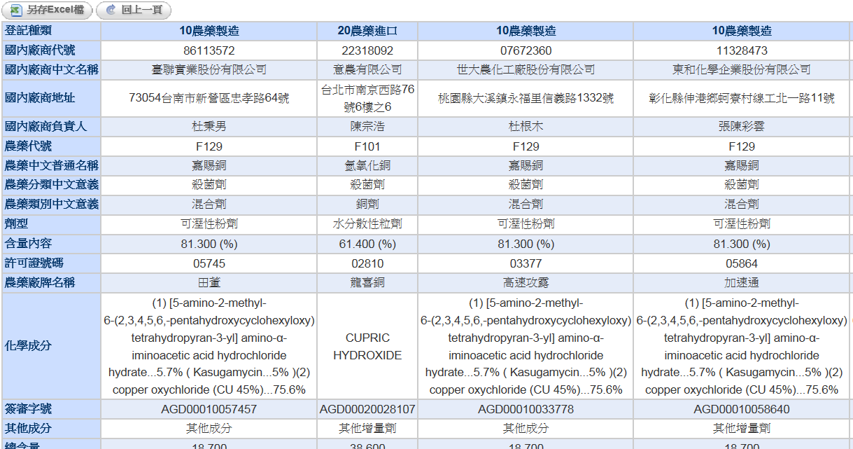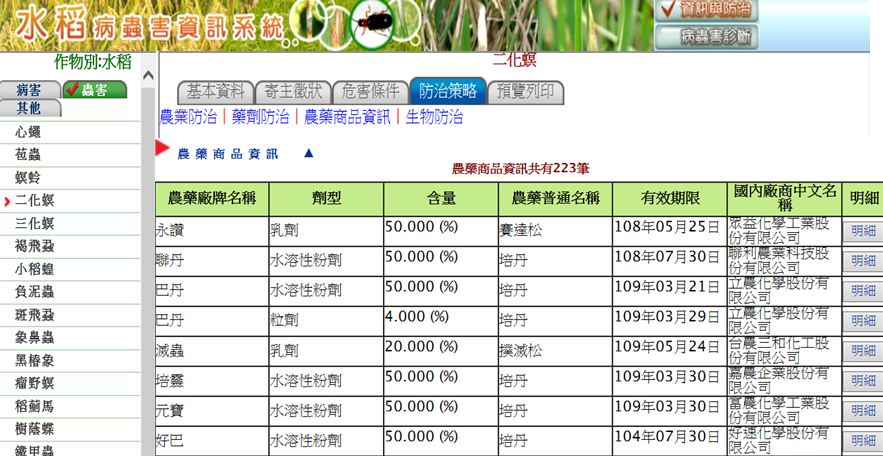 防治策略項下有農藥商品資訊,將列出符合本次所診斷之病或蟲害的用藥資訊,如圖4所示,選取的農藥商品之農藥使用範圍資料,提供農民施用藥劑的正確訊息以免造成用藥不當情形發生,亦提供該農藥應用在其他作物病蟲害的使用範圍資料。