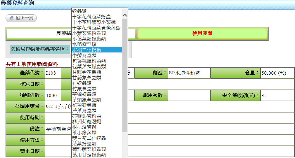 圖4、水稻病蟲害資訊系統的「防治策略」頁面。(A) 農藥商品資料,(B)農藥使用範圍。 |