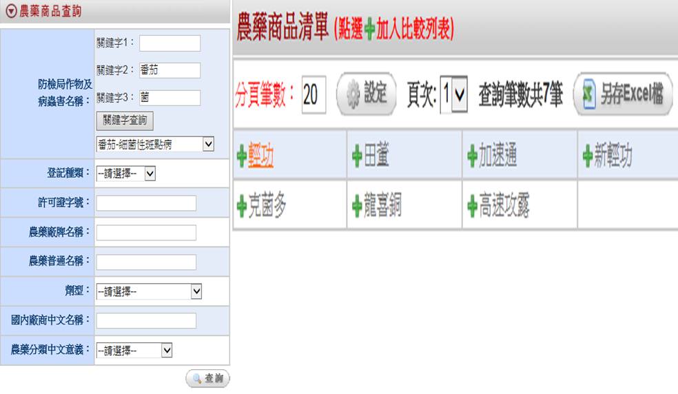 本系統將逐年擴充作物病蟲害診斷與防治方法之資訊內容,為顧及其他作物栽培者對於農藥使用資訊之取得,亦將介接自動植物防疫檢疫局的農藥資料,以簡單易操作的條件式導引查詢畫面提供服務,此位於作物優質生產整合資訊平台,點選左側視窗的「防檢局農藥商品查詢」。查詢結果除上述圖4所列農藥基本資料與使用範圍內容,並增加比較多筆農藥基本資料的功能,如圖6所示,讓農民於使用農藥前可以多了解相關內容,慎選農藥與正確用藥以免造成不必要的損失或農藥殘留情形。