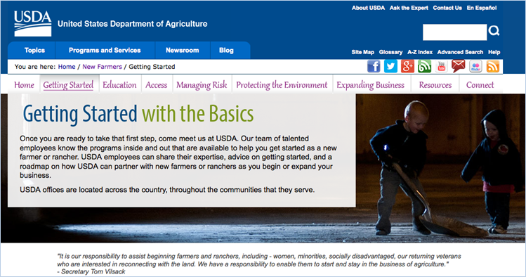 美國New Farmers網站除了提供新進農民搜尋鄰近的服務中心,提供現場諮詢服務,更整合所有美國農業部所提供的資源,成為新進農民農業知識與資訊來源的最佳引導。主題包含「教育」、「土地與資本取得」、「風險管理」、「環境保護」、「商業拓展」等。而其中農業風險包含日常業務風險、自然災害風險,生產者需定期管理財務、市場、生產、人力資源以及法律風險,因此「風險管理」便是提供這些資訊協助生產者規劃需求;農民如何保護環境,創造好資源給新進農民與農場管理者,「環境保護」中提供很多工具協助保留這些紀錄,並有助於確保土地的未來。