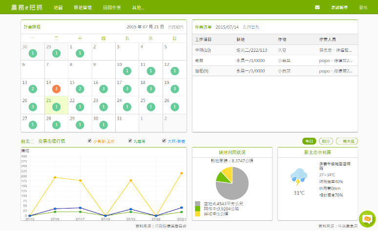 介面操作好簡單:提供完善、實用且容易上手的管理後台,系統功能包括基本資料、耕地栽培、田間作業、工作排程、資訊查詢(如氣候、農產品交易行情)等,可直接將栽培資訊上傳至「農產品產銷履歷系統」,亦可匯出田間作業紀錄檔案,列印紙本運用。 |