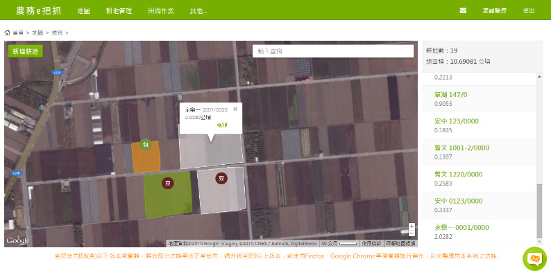最便利的耕地管理工具:用地圖檢視耕地所在位置與範圍,快速掌握耕地狀態。 |