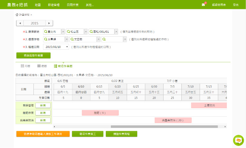 栽培曆好友善:實用的作物栽培作業曆工具,針對作物、品種進行規劃田間工作排程,統籌管理農場的田間作業任務,進行人員安排並檢視工作狀態。 |