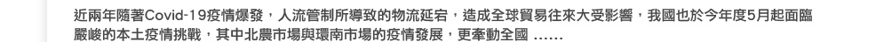 本期電子報首先介紹IoT技術導入農業水資源智慧管理之相關案例,帶領讀者一窺精準資源管理應用資訊。同時分享國外農業市場交易數位轉型之案例,以期能透過資通訊技術整合應用,降低Covid-19疫情對市場之影響。